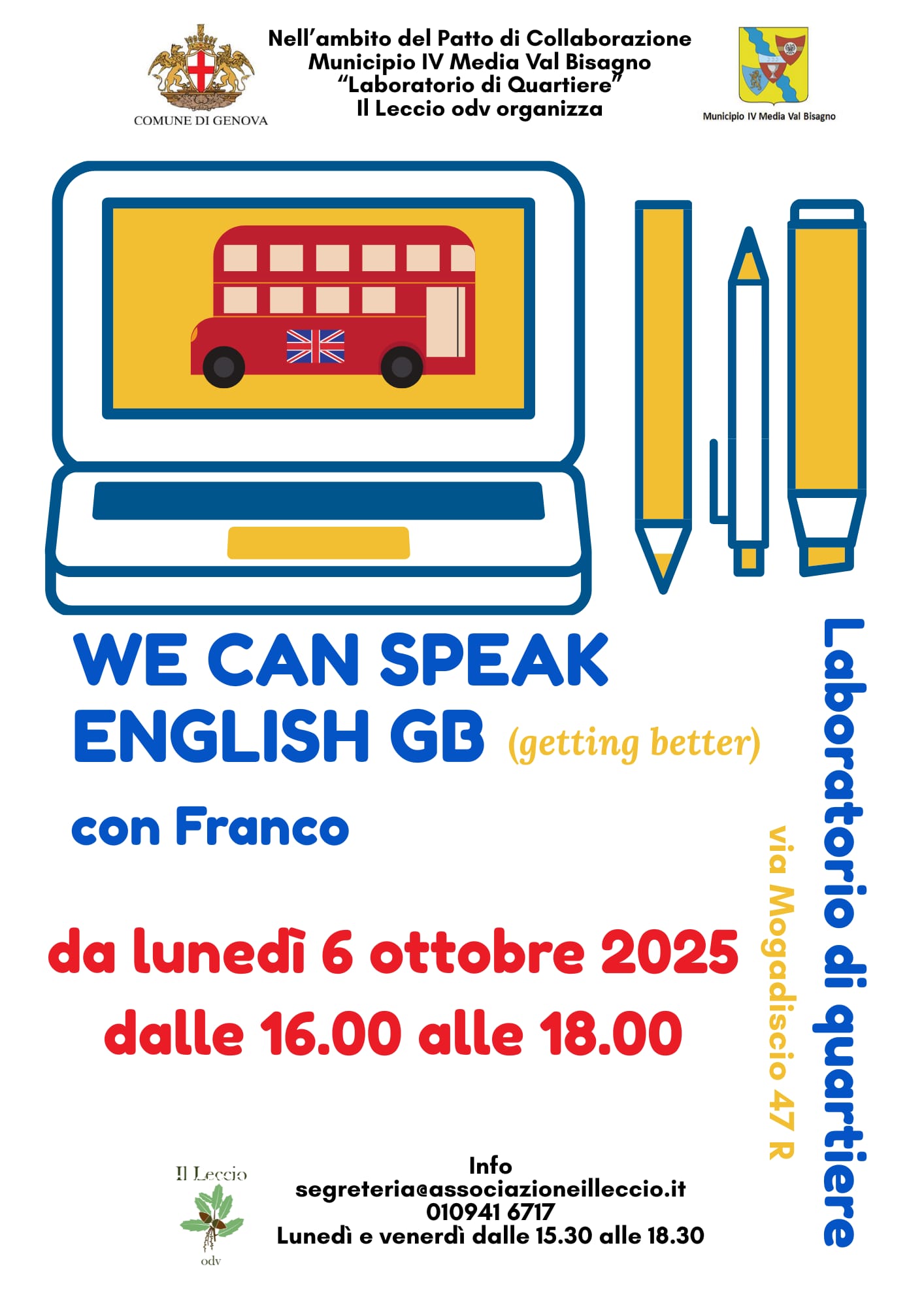 Il Laboatorio "We can speak English GB (Getting Better)" si svolge al Lunedì, a partire dal 6 ottobre 2025, dalle ore 16.00 alle ore 18.00.