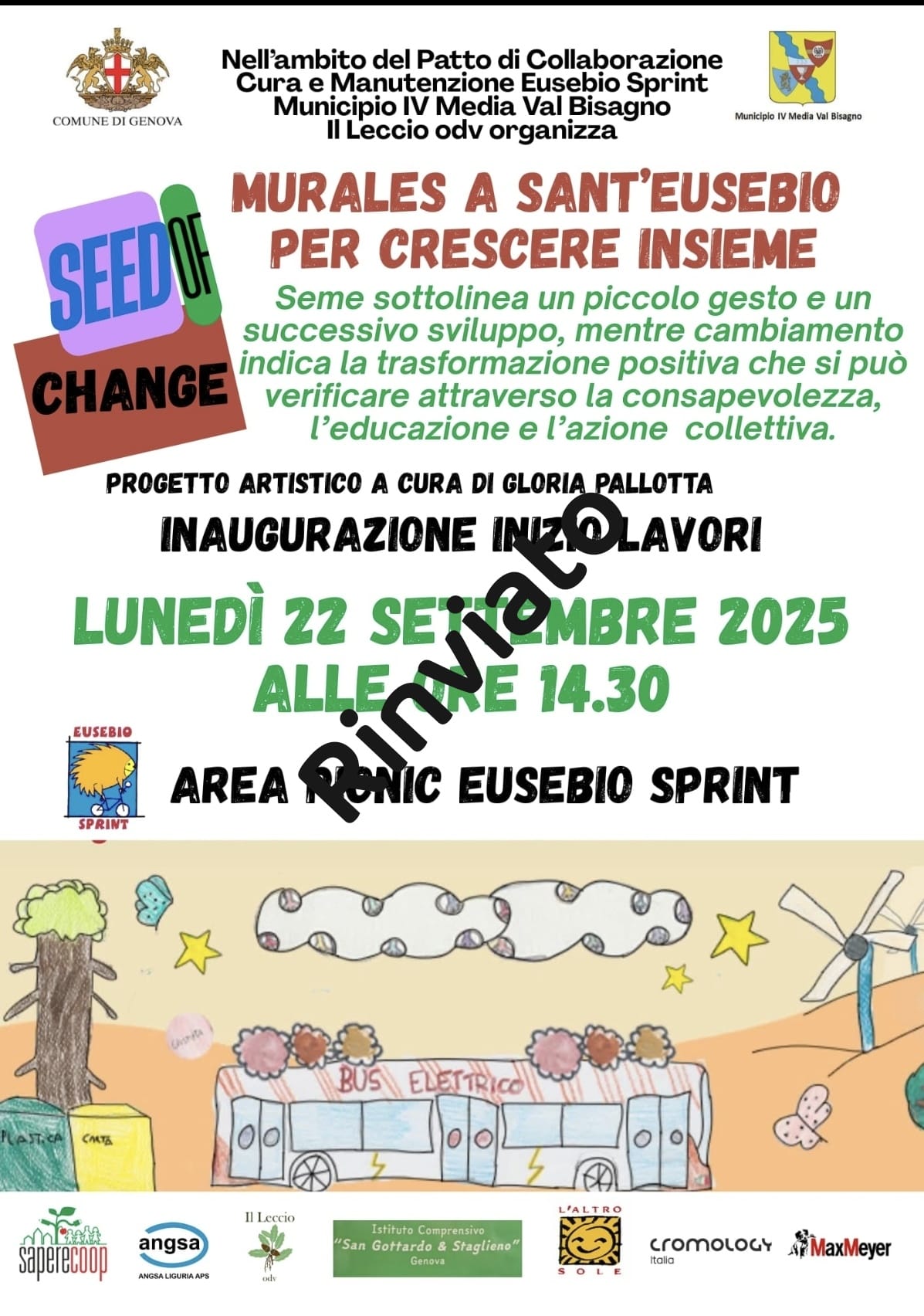 Vogliate prendere nota che evento di lunedì 22/09/2025, alle ore 14.30, per il murales con le scuole ad Eusebio sprint, è stato ANNULLATO e rinviato a data da definire!