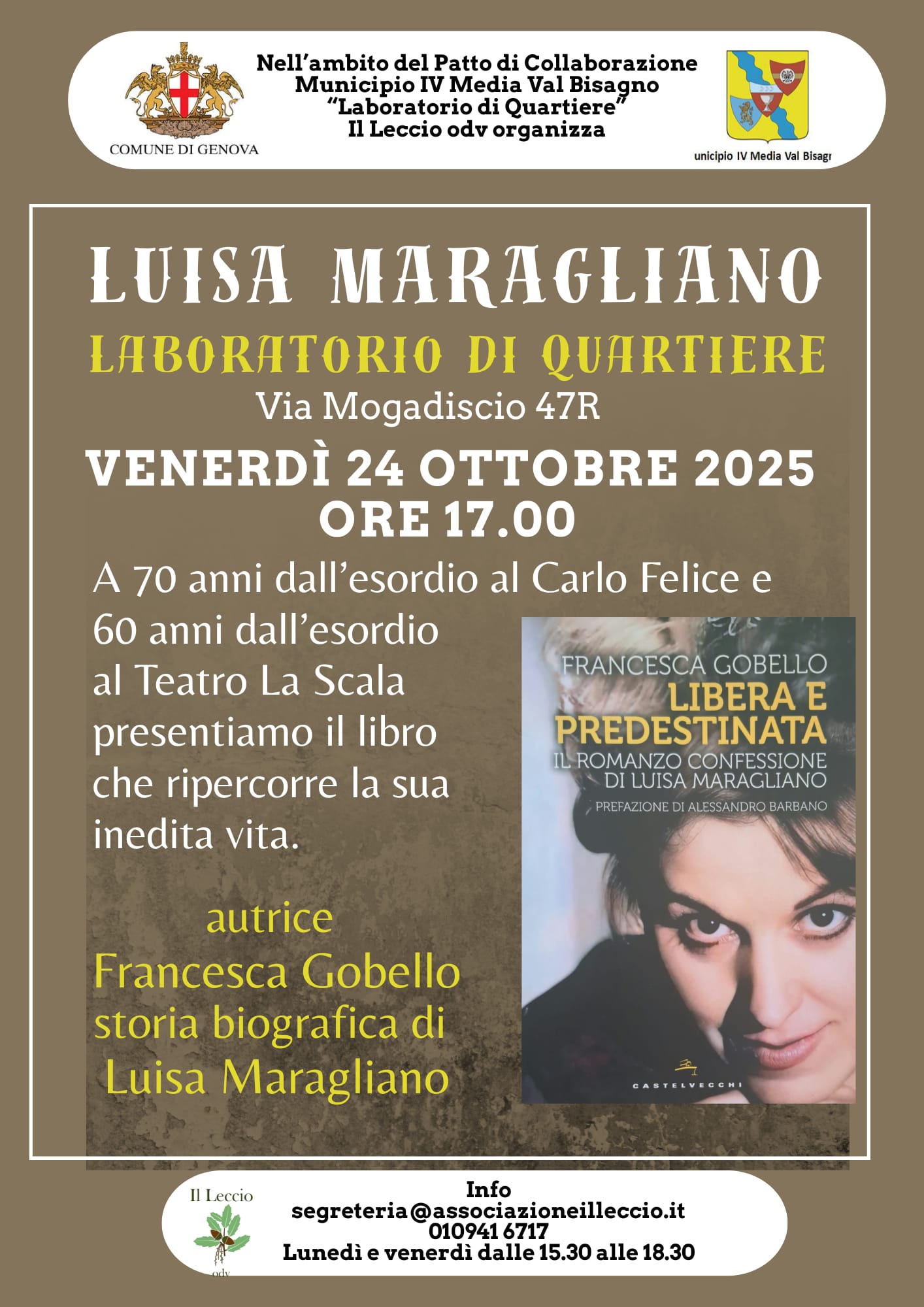 - Venerdì 24 ottobre 2025, alle 17.00, Luisa Maragliano parlerà di "LIBERA E PREDESTINATA", il libro biografia sulla vita della grande soprano, a 70 anni dal suo debutto al Carlo Felice.