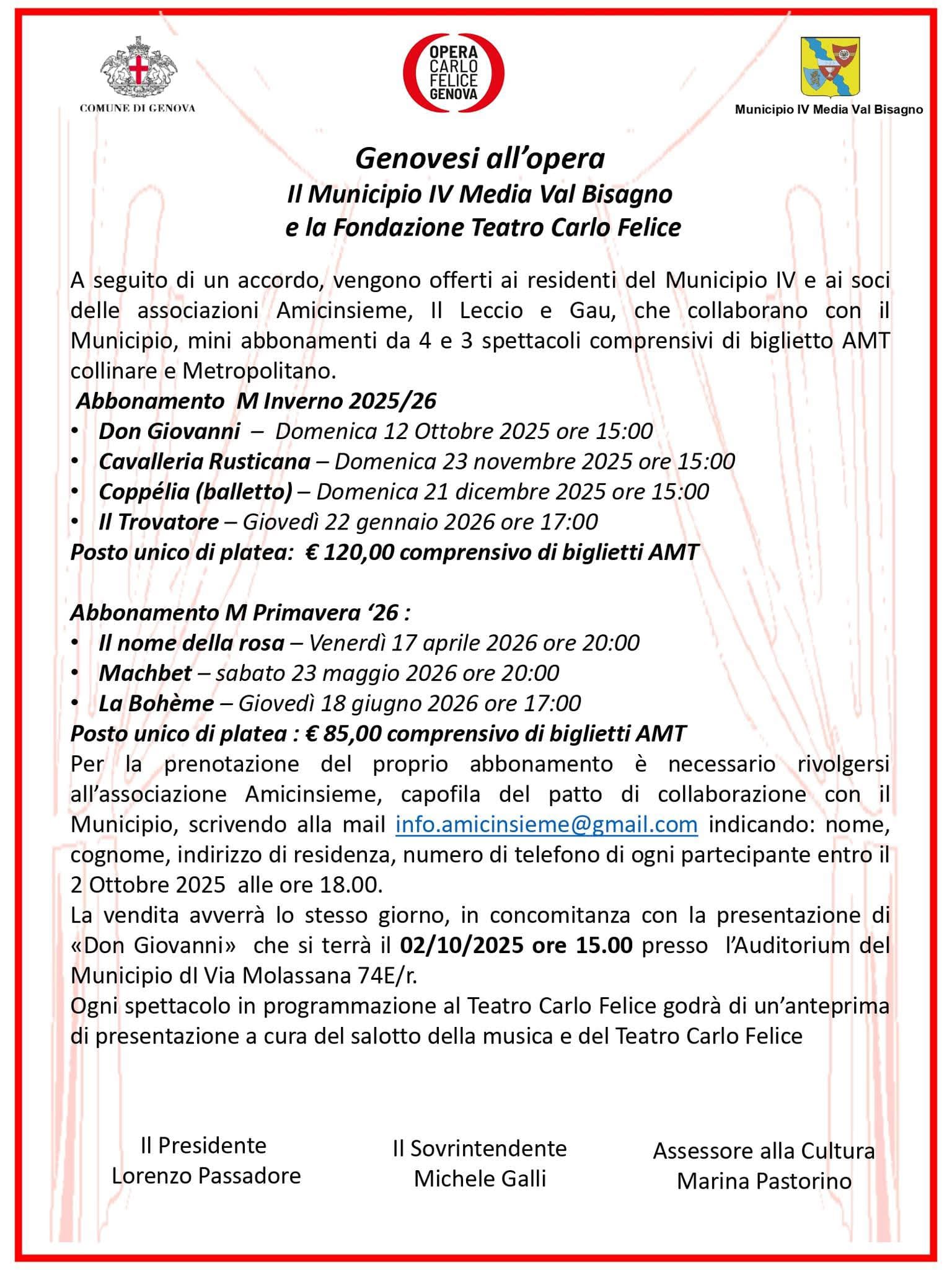 Torna la possibilità, come nelle scorse due stagioni, di approfittare di un valido accordo tra il Municipio IV Media ValBisagno ed il Teatro Carlo Felice, che propone, agli abitanti del Municipio, la sottoscrizione di mini-abbonamenti super scontati per assistere a opere e balletti della stagione 2025/2026.